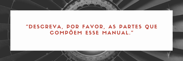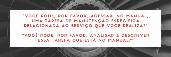 Pode ser pedido ao candidato informar sobre noções das abrangências dos diversos manuais aplicáveis e as diferenças entre eles. Após essa verificação inicial, você pode pedir ao candidato um manual técnico que é utilizado em um serviço comum que este realiza, como, por exemplo, manual de serviço da aeronave que é trabalhada na organização de manutenção aeronáutica, ou motor que é revisado nessa organização, etc.