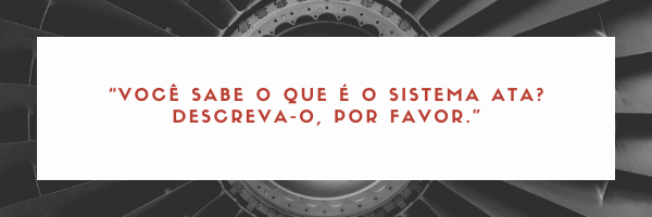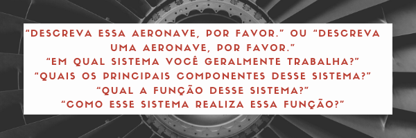 Peça ao candidato para descrever os sistemas que compõem uma das aeronaves trabalhadas por ele ou, caso não haja nenhuma disponível, você pode fazer perguntas gerais sobre aeronaves. Adicionalmente, você pode fazer perguntas sobre sistemas menores, recomendando-se começar, entretanto, por conjuntos maiores para, depois, se iniciar o detalhamento.