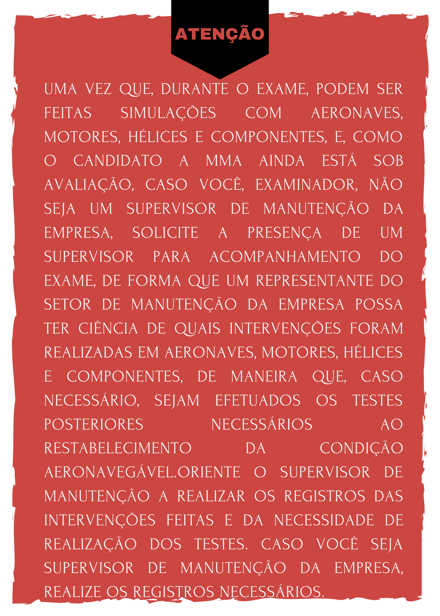 O desembaraço do candidato no andamento do serviço deve ser avaliado. Uma vez que se trata de uma avaliação oral e prática, essa visão se torna de extrema importância e crucial para a diferenciação da avaliação teórica na qual o candidato já fora aprovado. Muitas vezes, não é possível dissociar os conceitos teóricos das respostas do teste prático, pois os primeiros constituem fundamento da prática. O teste prático se refere ao saber fazer, diferentemente do teste teórico que se refere ao exclusivo conhecimento sobre determinado assunto. Porém, os dois conceitos se complementam. Aplicando-se o CHA (Conhecimento, Habilidade e Atitude) da Pedagogia, enquanto no exame teórico o foco é mais acentuado no “C” (Conhecimento), no exame prático o foco é mais acentuado no “HA” (Habilidade e Atitude). Apesar disso, ainda teremos o “C” amparando as respostas relacionadas ao “HA”. Na seção 65.79 do RBAC 65 é citado que o exame é oral e prático. Por isso, quando necessário, algumas situações podem requerer explicações sobre sistemas, identificação de partes, etc. Apesar de se procurar focar na avaliação prática, a explicação oral pode servir tanto para casos práticos em estudo durante o exame, quanto para que o candidato a MMA explique sobre sistemas que não estiverem disponíveis, mas que sejam considerados para a avaliação.